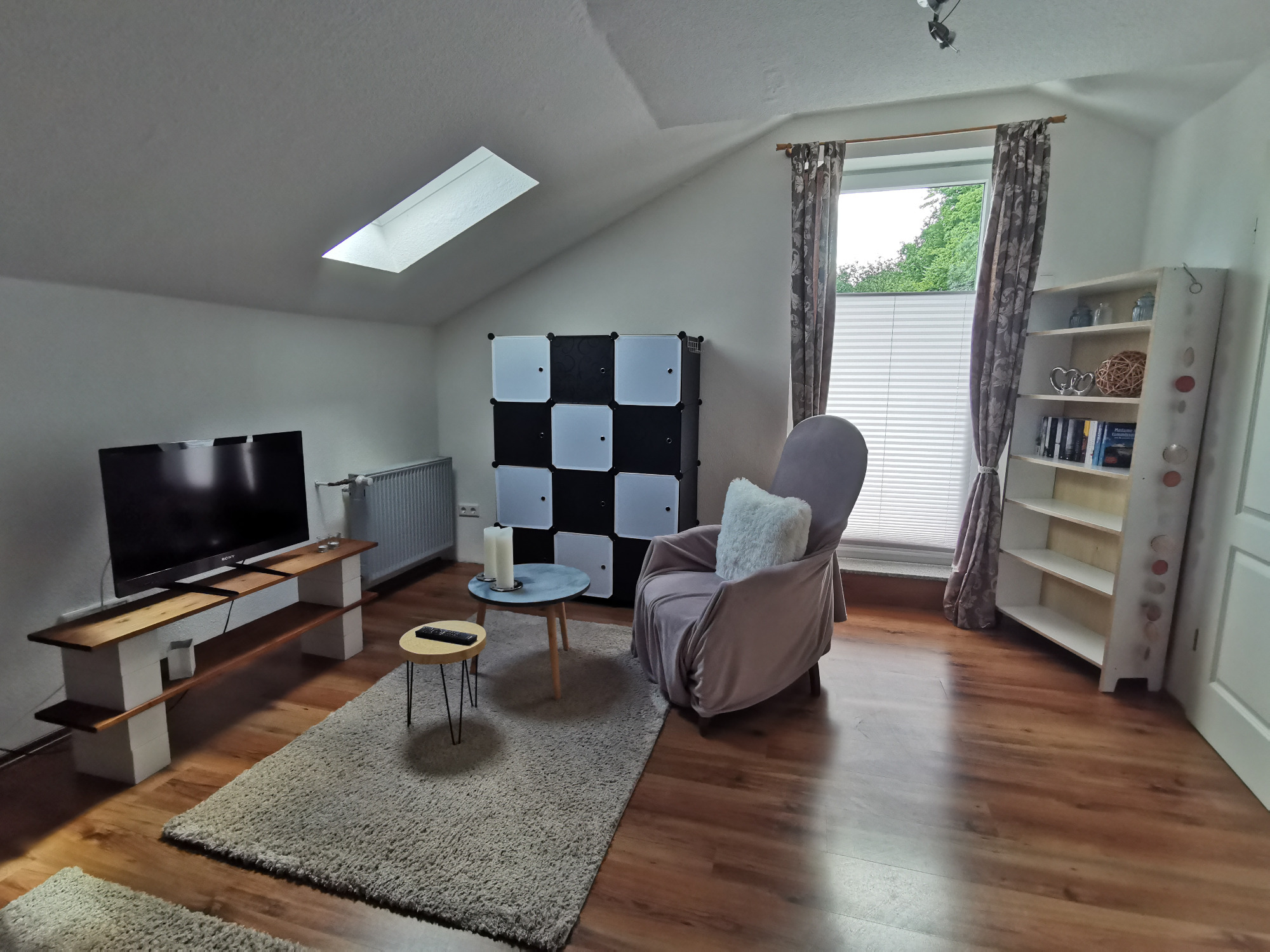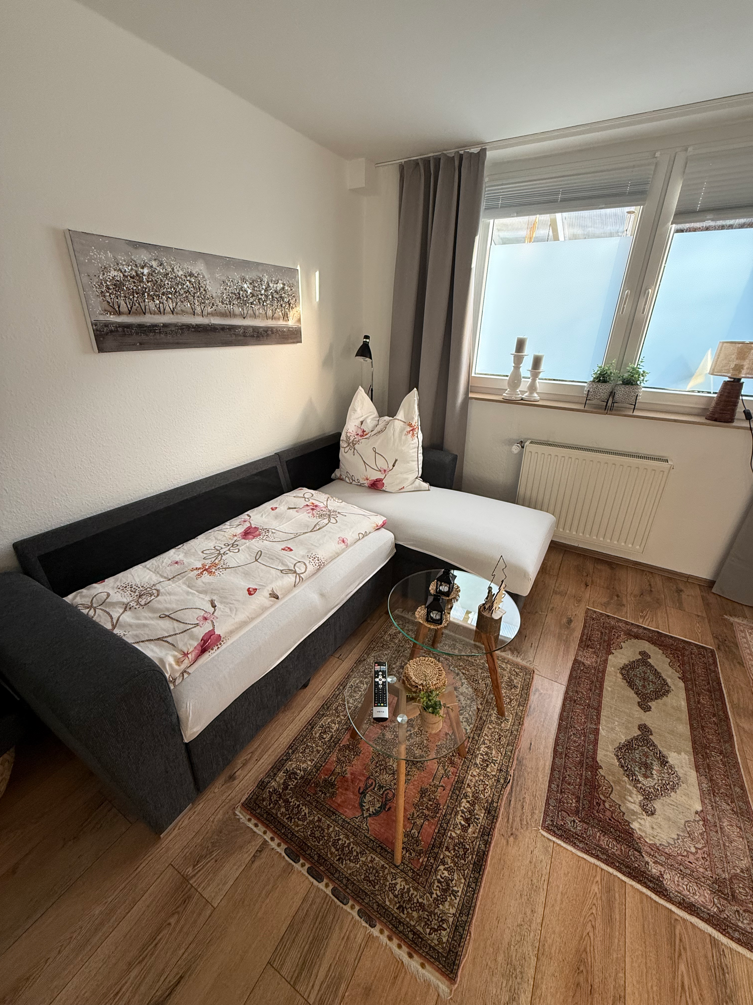 Der Wohnbereich befindet sich im Erdgeschoss, technisch ausgestattet mit Smart-TV und Bluetooth-Box. Die Schlafcouch misst ausgezogen 140 x 190 cm.