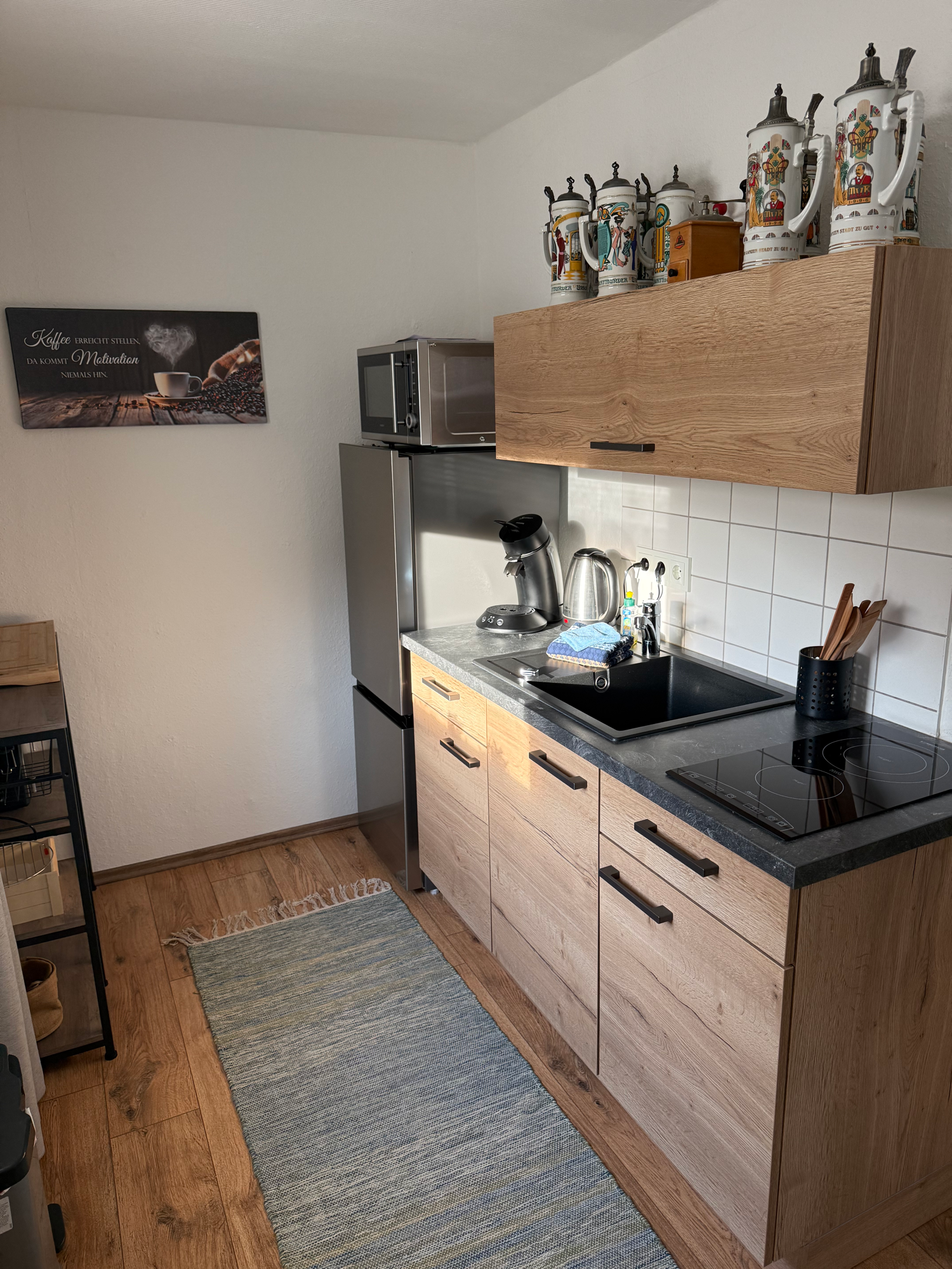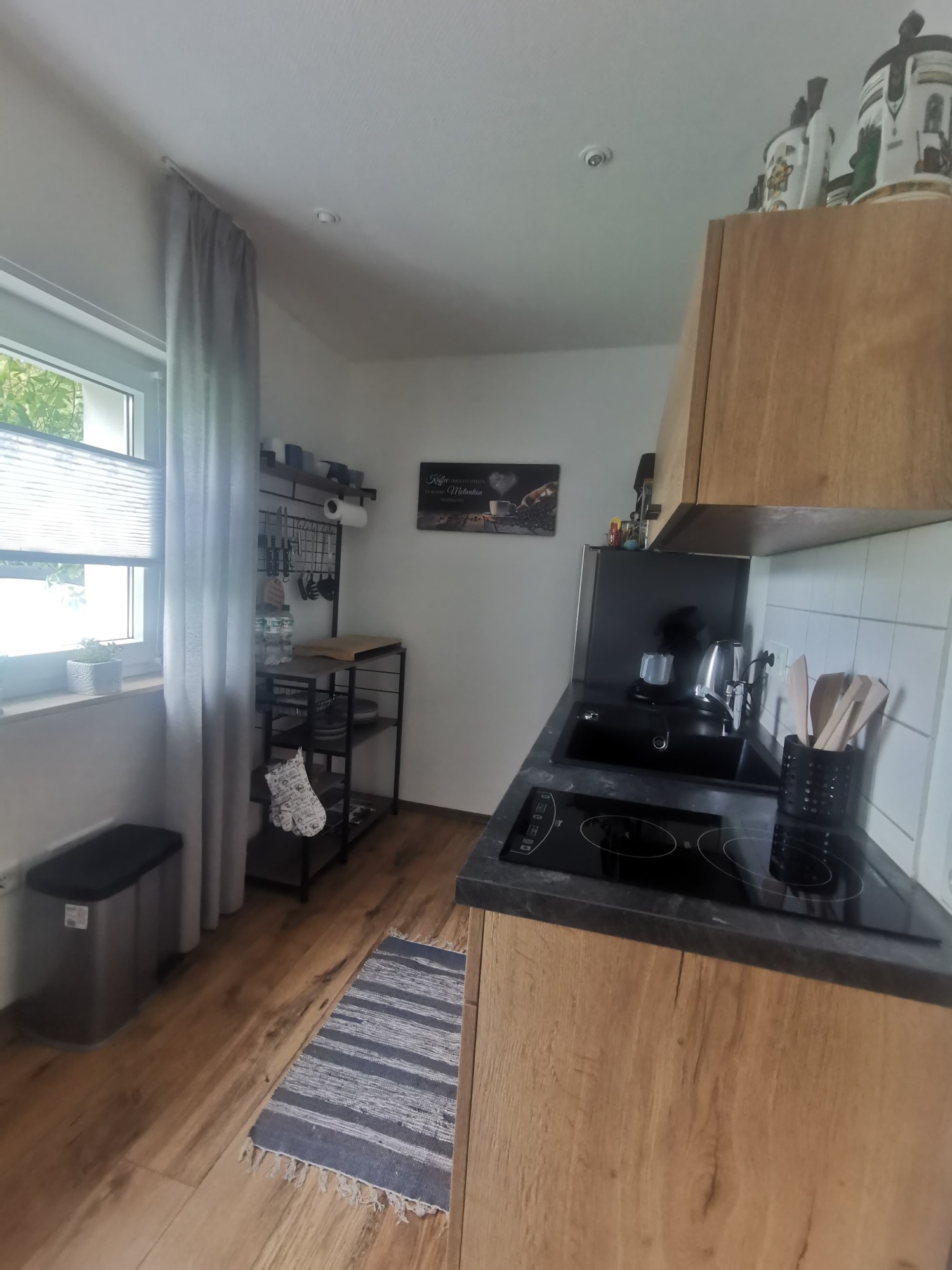 In Ihrer Küche finden Sie einen Kühlschrank mit Gefrierfach, einen Herd mit zwei Kochfeldern und eine Mikrowelle mit integrierter Backfunktion. Auch vorhanden sind Kaffeemaschine, Wasserkocher und Toaster. Während Ihres Aufenthalts ist für Kaffee und eine Auswahl an Teesorten gesorgt. Der Esstisch mit vier Plätzen lädt zum gemütlichen Beisammensitzen ein.