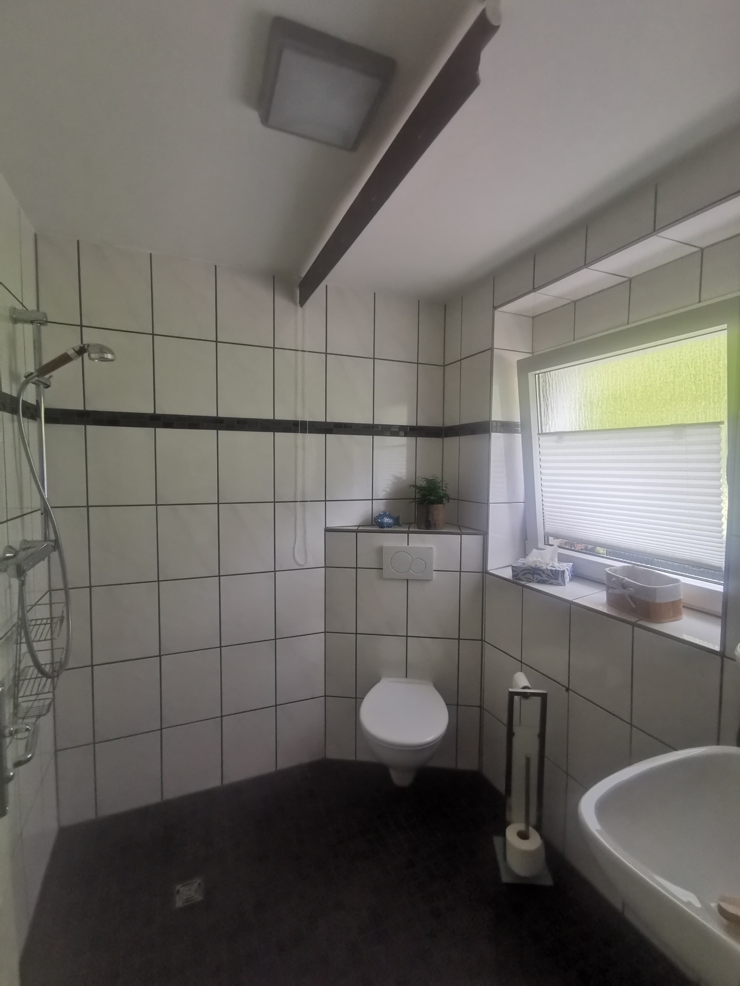 Das Badezimmer im Erdgeschoss ist ausgestattet mit Dusche, Waschbecken und WC. Clou: Das Duschrollo ermöglicht Ihnen viel Bewegungsraum.